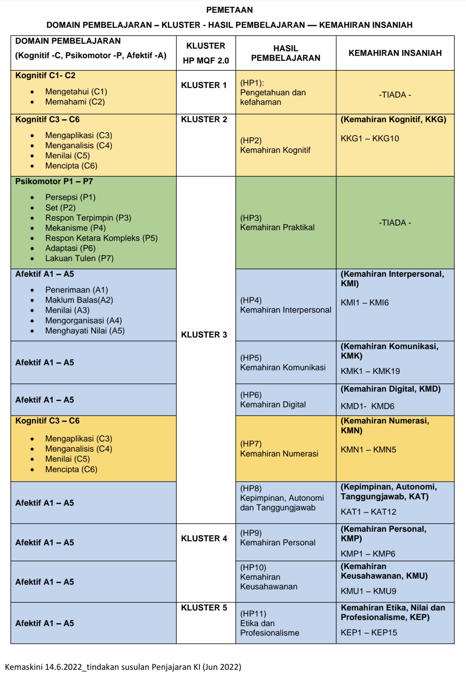 Berikut ialah pemetaan domain pembelajaran, kluster, hasil pembelajaran dan kemahiran insaniah seperti di bawah ini.